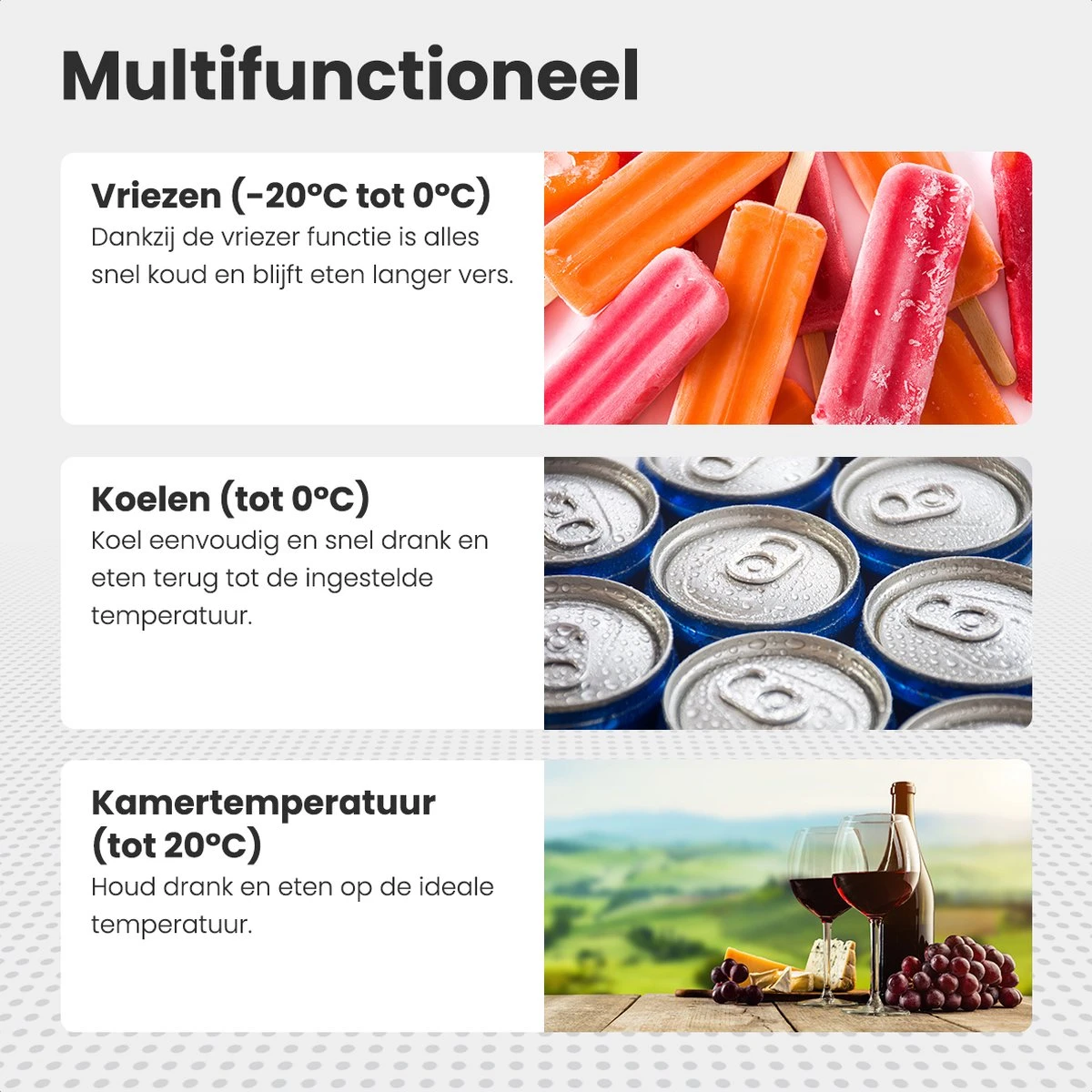 De elektrische koelbox is voorzien van verschillende standen, zoals een Max stand voor extra koeling en een Eco stand voor een lager stroomverbruik. Dit geeft je meer flexibiliteit en maakt het gemakkelijk om de koelbox aan te passen aan elke situatie. Met zijn compacte design is dit dé perfecte koelbox voor welke gelegenheid dan ook. Genoeg redenen dus om deze koelbox te kopen!