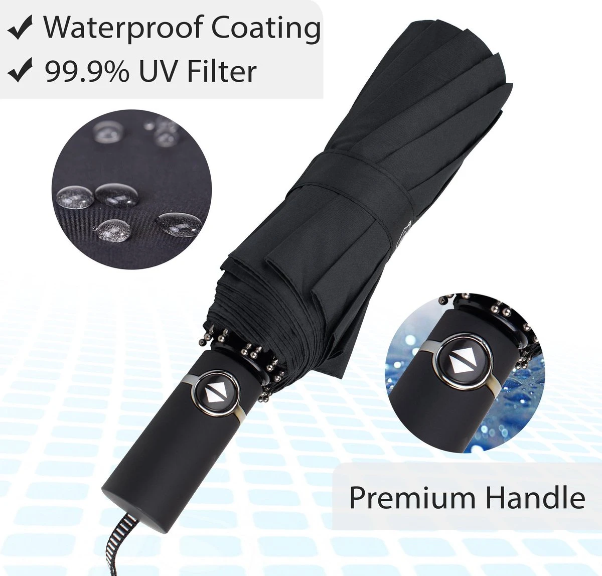 ✔ Automatisch openings- en sluitingsmechanisme (paraplu opent en sluit met 1 drup op de knop)